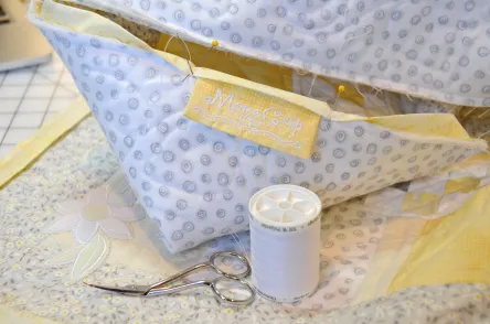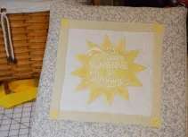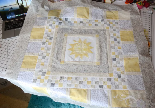 Hannah & Quincy are having a little girl!!! – I was so excited to make something special from Chelsie, Allie & myself! I decided on the “Sunshine” theme, so off I went to look for some “sunshine” in fabric only to realize that there was nothing I liked. I know that I’m better off doing my own thing. So I bought a beautiful white, a gorgeous soft grey floral and the yellow fabric?… I brought one piece home but was soooo incredibly unhappy with it.