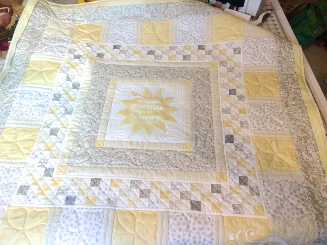 There were two flowers on her robe and I had every intention of using both. The lower flower on her robe went on the lower corner of her quilt. I knew exactly what I wanted to do… you can’t look at that saying without singing it in your head… I had the grey borders representing the “cloudy days” so I ended it with “You never know dear, how much I love you, Gram” I had tears running down my face because I felt that Hannah’s Gram loved it.