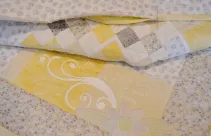 I knew that it could be so much more, I needed it to be something special. As I was looking at the pile I started thinking about Hannah and her Grandma. I had an idea, I decided to call Hannah’s Mom and ask if I could please have an article of Grandma’s clothing to sew into the quilt. We met two days later and I was given Grandma’s yellow seersucker robe. It was faded and worn, loved up and best of all I knew Hannah would recognize it given the fact that they roomed together! I was completely thrilled to work it into the quilt. Now I was excited! So much so that I got up at 4:20 am and gathered a few more pieces to balance out the light yellow.