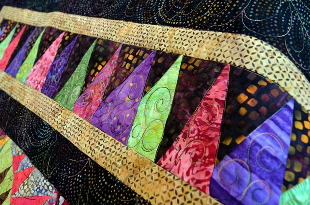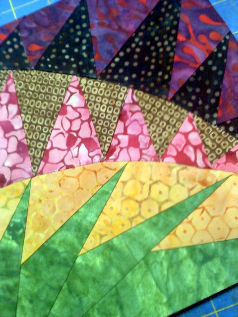 This quilt called “Untitled” by Karen K. Stone was started the day my Chelsie closed on her first house. Craig, Chelsie & I came out of her closing and walked right into a carpet place selling area rugs for “cheap cheap”. Going through the pile I recognized a rug that I had secretly been drooling over in a magazine. It was ½ the price and in the car it went for the first piece for Chelsie’s new home to be. I’m really pretty good at memorizing colors so through my fabrics I went. I decided to not only match up the area rug but pull in Chelsie’s personality and set the tone for my decorating. So much fun since carpet & paint and a million other components will come into play.